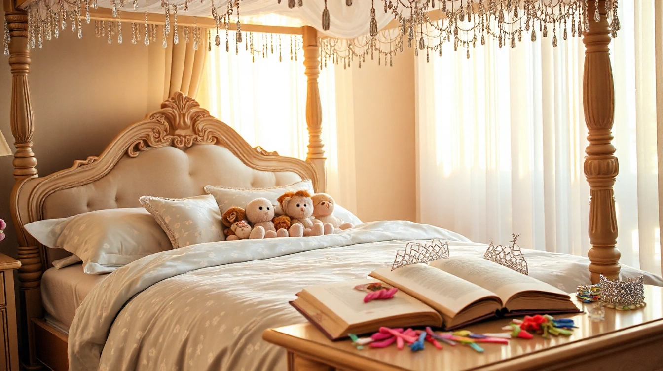 Pour créer une décoration lit baldaquin fille réellement féerique, le choix des couleurs est primordial. Optez pour des teintes douces et harmonieuses, comme le rose poudré, le blanc cassé ou le lavande, qui apportent une ambiance légère et apaisante. Ces couleurs se marient parfaitement avec des tissus transparents ou délicats, valorisant ainsi le style romantique du lit baldaquin. N’hésitez pas à associer plusieurs nuances complémentaires pour un effet visuel élégant sans surcharge.